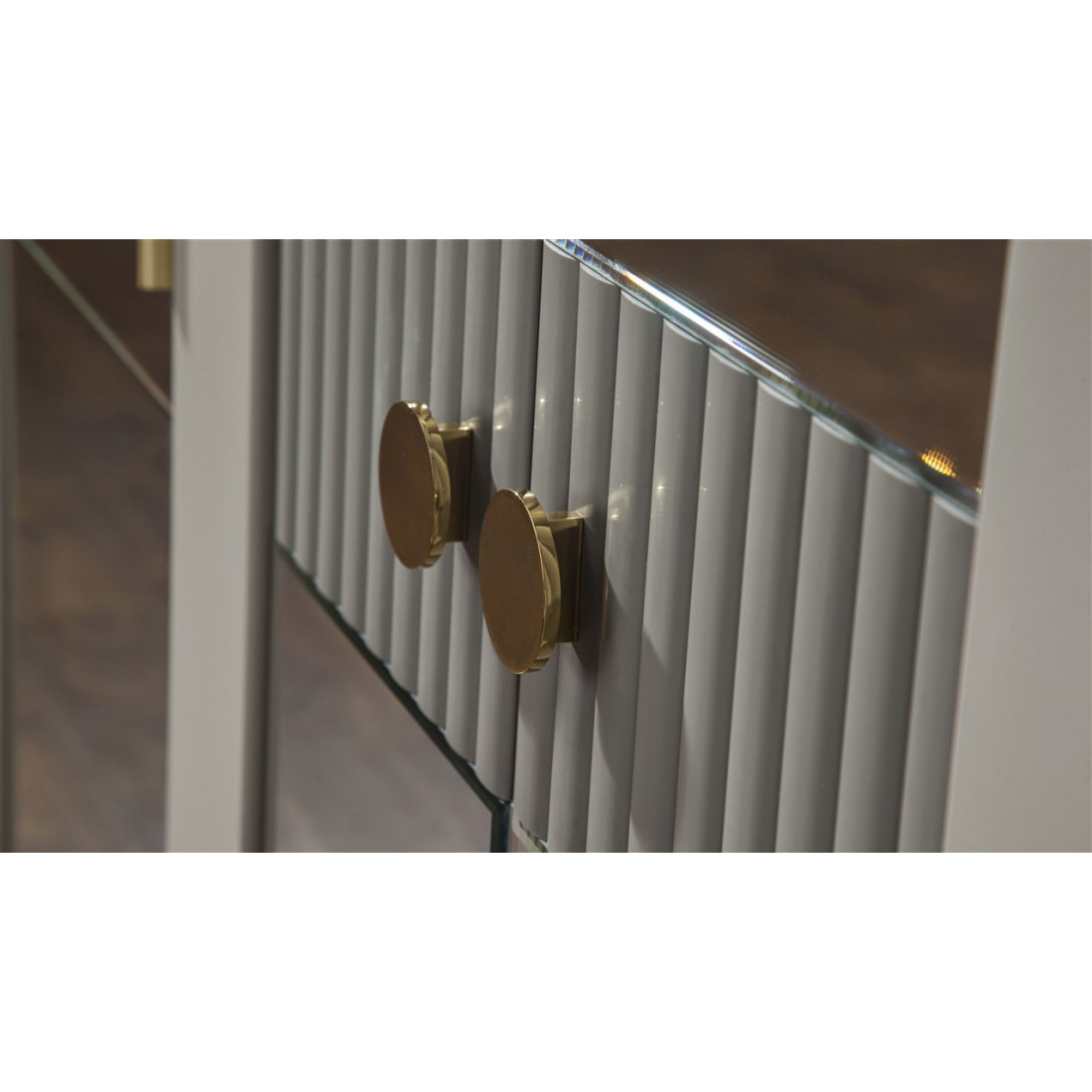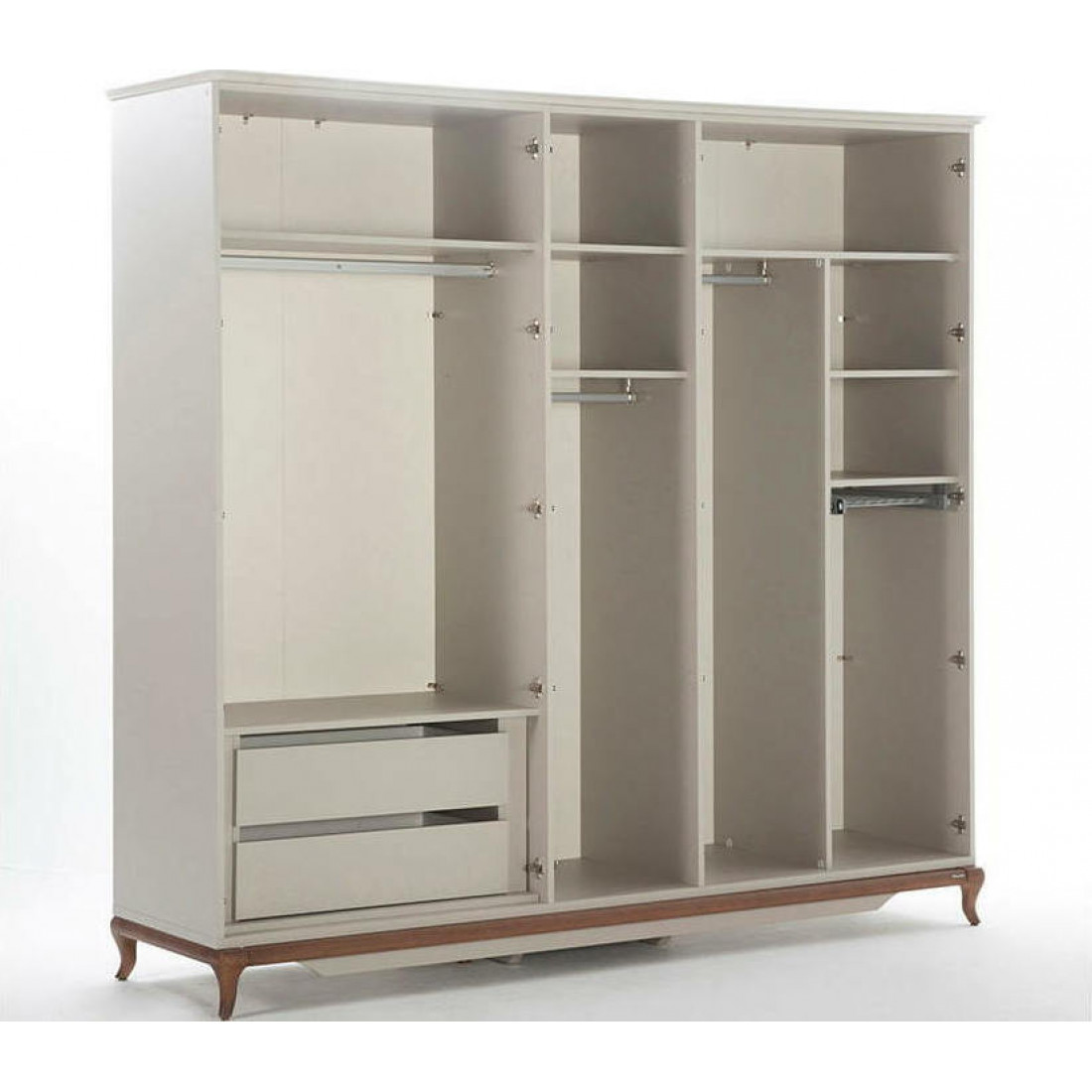 Шкаф платяной 5-дверный серии Pesaro Bellona. Изготовлен из высококачественного ЛДСП производства Турция, класс эмиссии формальдегидов Е1. Зеркальная дверь в центре с прямоугольной ручкой, двери справа и слева со вставками серого цвета и большими круглыми ручками под бронзу. Ножки и рамка из натурального дерева с оттенком медовый орех. Размеры и наполнение шкафа позволит аккуратно разместить большое количество вещей. Двери и ящики с доводчиками, обеспечивающими плавный ход и безопасность.
