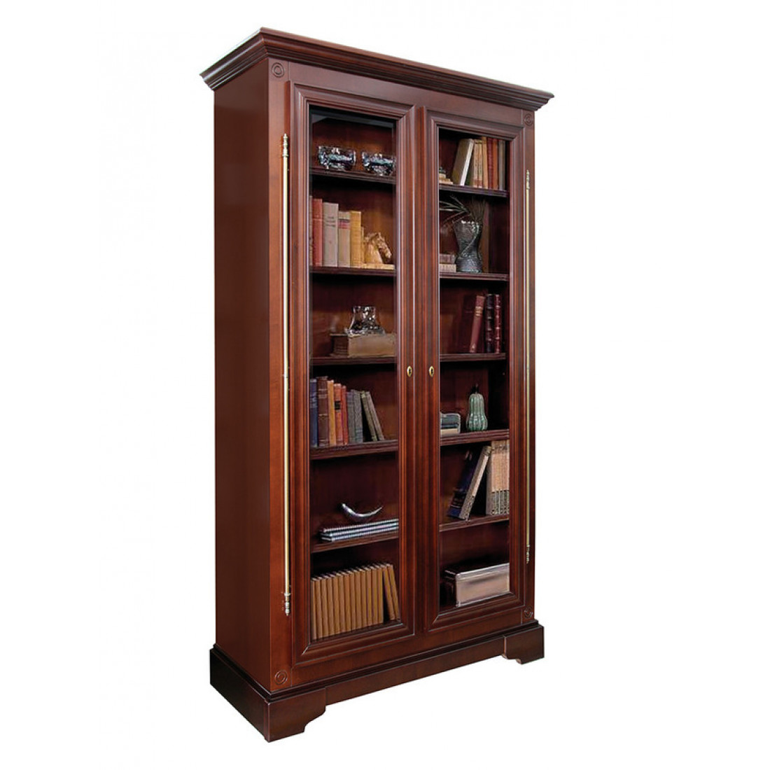 Элегантный двухдверный шкаф для книг с витриной «Полонез» ММ-174-08 выполнен из массива и шпона бука, отделан экологически чистыми составами на водной основе. Модель окрашена в сочный благородный оттенок «черешня», декорирована пилястрами и резьбой. Особого шарма модели придают штыревые наружные петли на двери и искусственная подсветка внутри витрин.