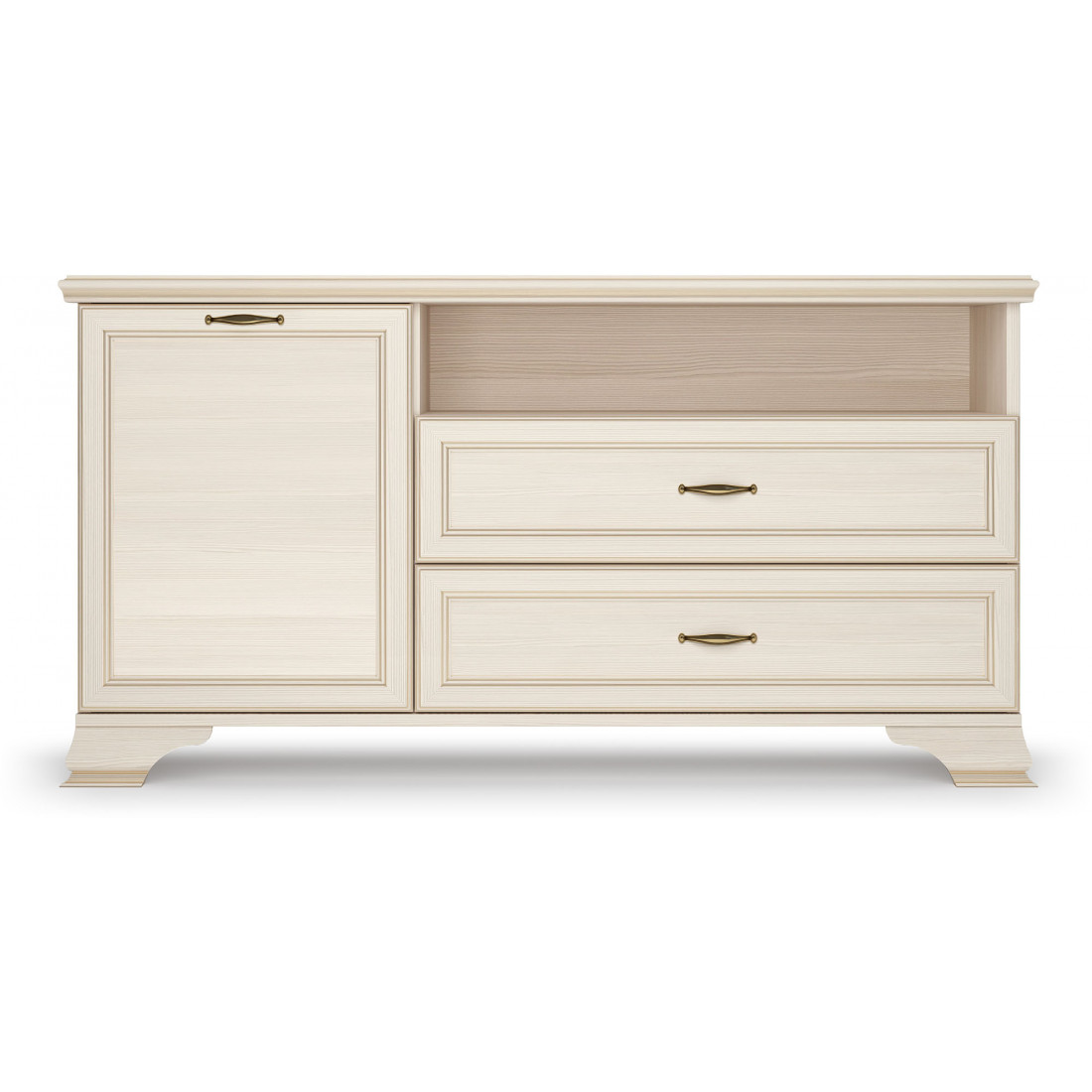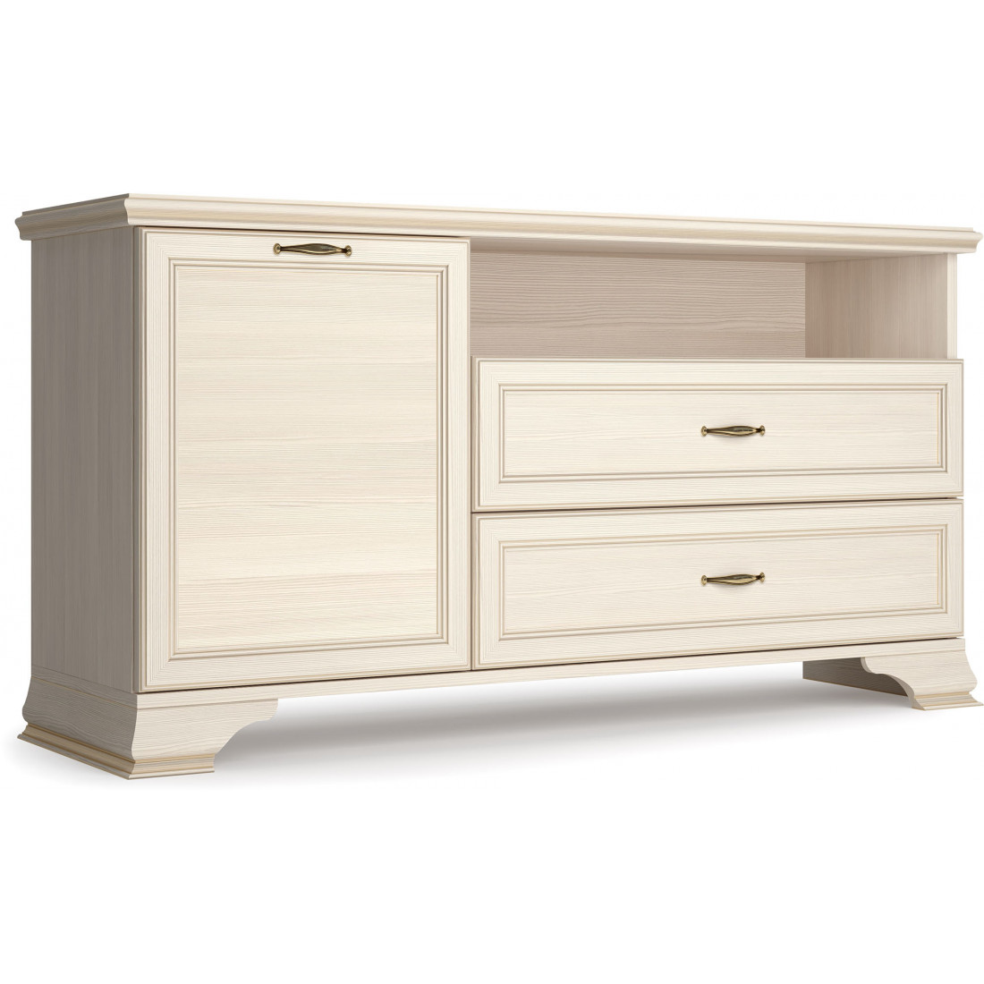 Коллекция производится в текстуре «бодега белый» с эффектом золотого патинирования. Облик «Сиены» дополняют рамочные фасады и карниз в классическом стиле, а также эффектные опоры из МДФ. Мебель комплектуются металлической лицевой фурнитурой премиум-класса в цвете «старая бронза» и надежной крепежной фурнитурой.