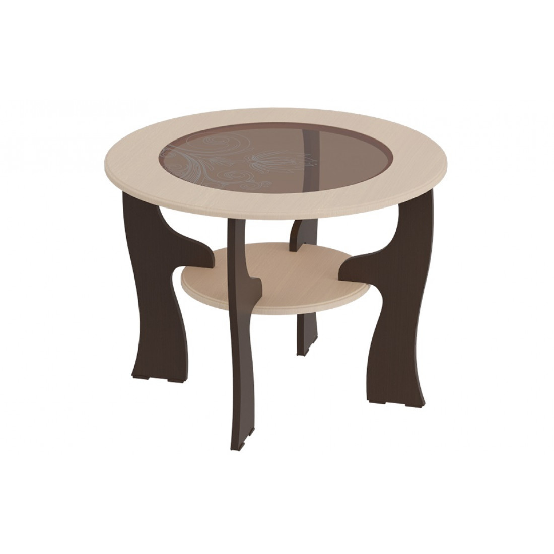 Элегантный журнальный столик в гостиную от фабрики МебельГрад со стеклянной столешницей круглой формы подойдет для оформления современного или классического интерьера. Стекло столешницы тонированное, декорировано пескоструйным рисунком. Варианты цветового исполнения: Дуб Сонома и Ель Карпатская, или сочетание контрастных Венге Мали и Клен с тиснением.